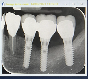 Examen radiologique: alvéolyse horizontale et perte osseuse au niveau de l'implant 36.
